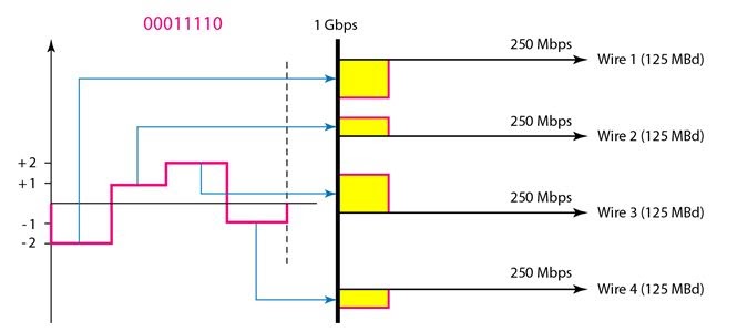 4D-PAM5 Line coding 방식을 간단하게 설명하자면 1000Mbps로 전송하기 위해서는 4Pair를 이용하여 송 수신을 하며,